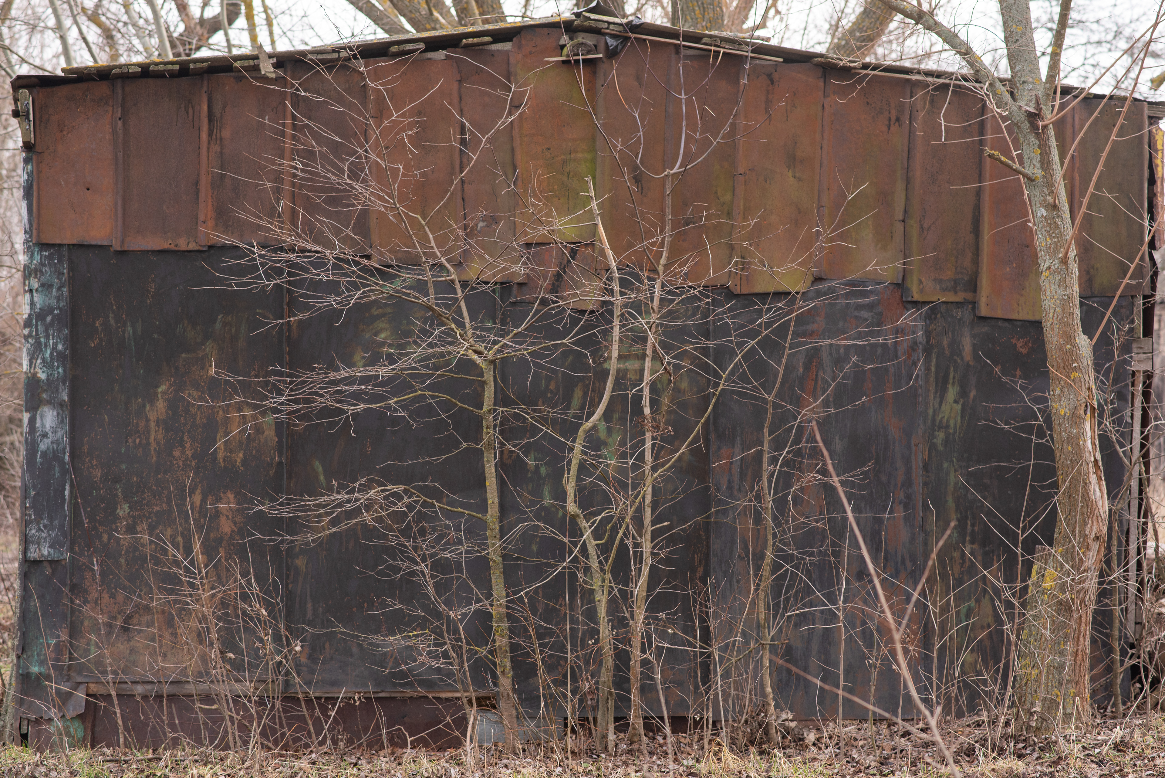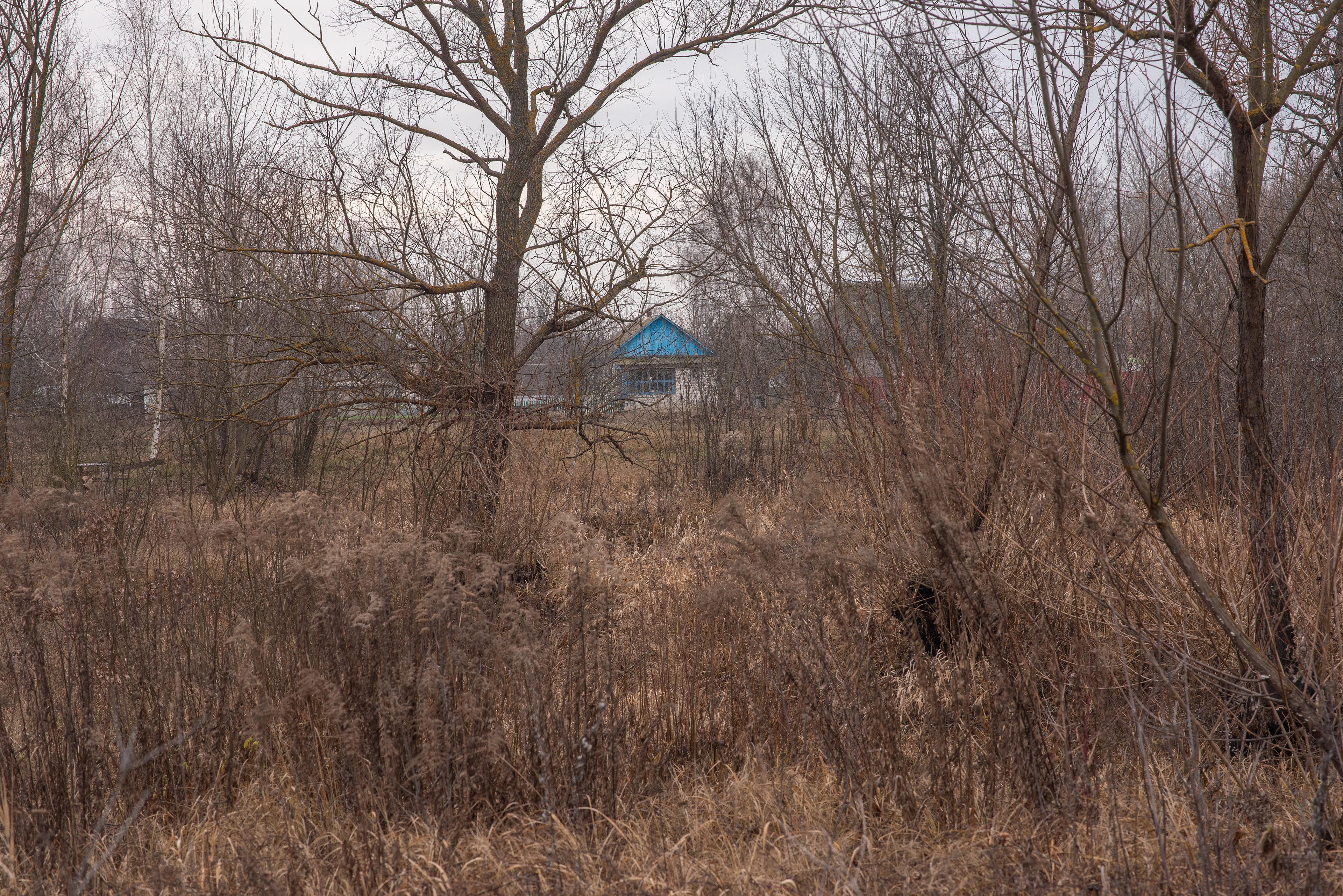 No one is around. Only small houses and sheds — some abandoned, some slowly dissolving into grass and branches. Fifty kilometers from Kyiv — close in geography, distant in perception — the landscape feels like another planet.